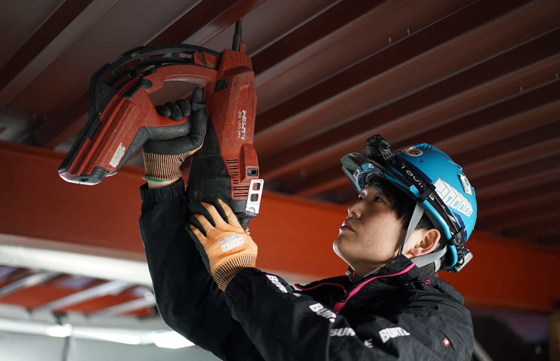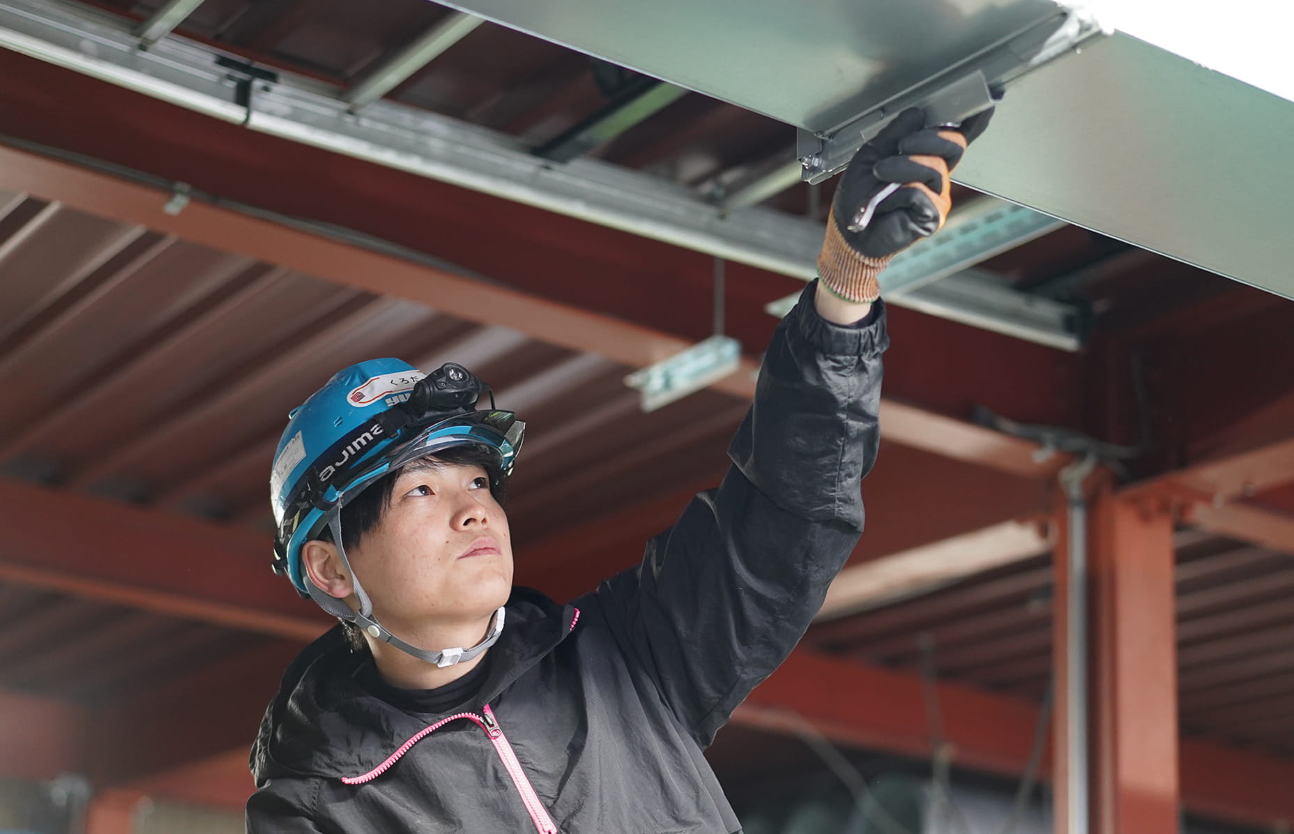 空気の通り道であるダクトの取付けを担当しています。現場では、図面だけでは見えてこない障害物があったり、複雑な構造だったりと、一筋縄ではいかない場面が多々あります。そこをどうやって避けて、一番効率よく、かつ美しくルートを繋ぎ込むか。自分の経験を活かしてルートを導き出し、計算通りにピタッとダクトが収まった時は、この仕事を 9 年やっていても変わらず大きな達成感があります。