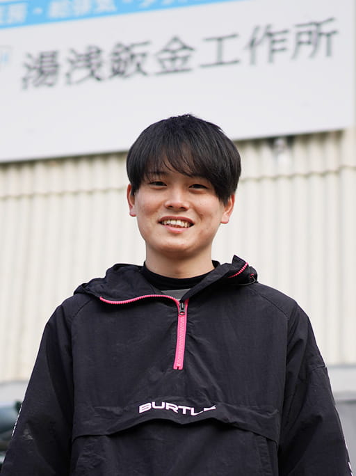 ダクト業界で9年のキャリアを持つ職人。既婚で2児の父。前職も同業だったが、家族との時間とさらなるステップアップを求めて湯浅鈑金工作所へ転職。現在は現場配属としてダクト取付けを牽引。豊富な経験を武器に職長もこなす実力派。