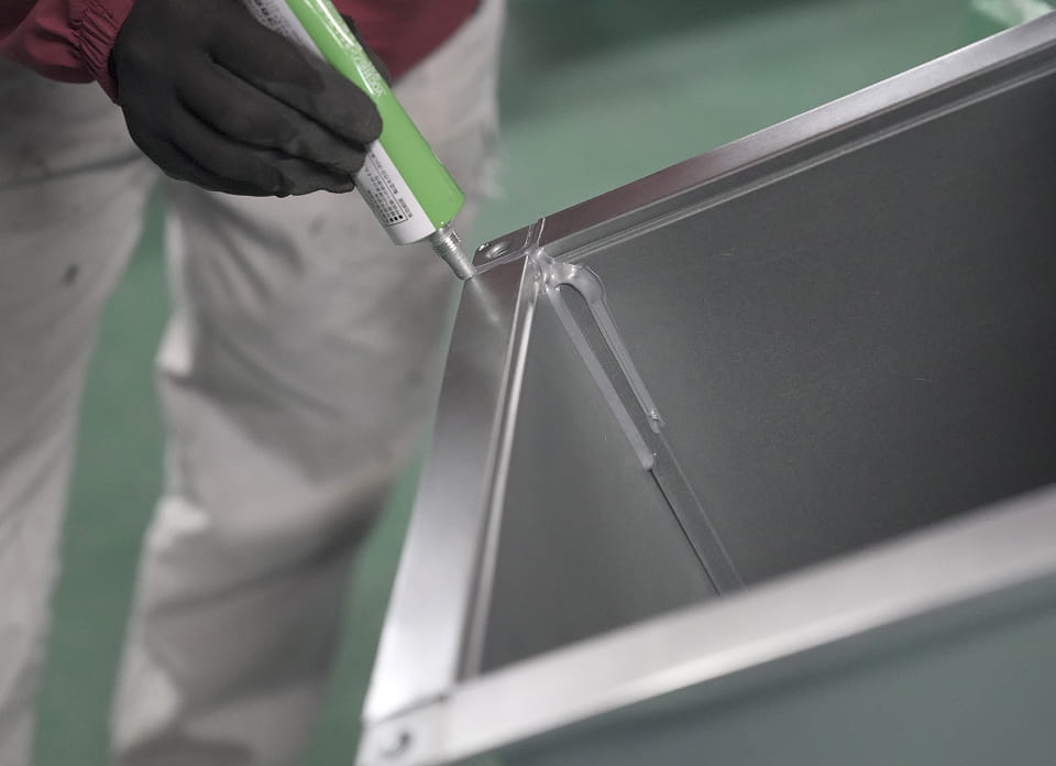 空気が漏れないように、つなぎ目や角部分にコーキング材を充填。防水性・気密性を高め、性能の高いダクトに仕上げます。